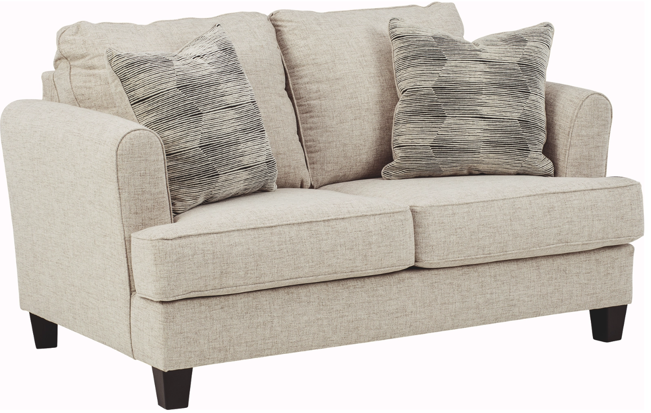 Whether you’re designing a cool and contemporary space or creating a warm and cozy modern farmhouse vibe, you can’t deny: this loveseat makes staying in for the night so enticing. Daring to be different, this designer loveseat wows with rounded track arms set at an angle for fashion-forward flair. Flatwoven linen-like fabric in a fresh neutral shade is sure to liven your space. Reversible seat cushions give this loveseat that much more staying power.