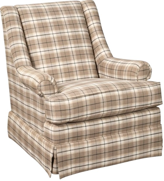 This swivel glider is among our most comfortable chairs- a true place to relax. It features plush cushioning for long lasting comfort and a perfectly proportioned seat depth and height. Classic elements such as the subtle wing shape, paneled arm, and skirt make it a familiar and easy-to-love style.Read More