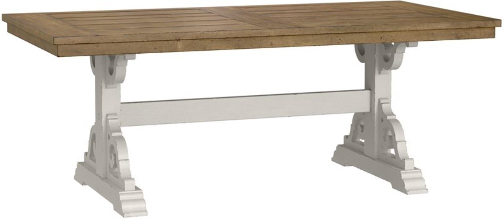 This trestle-style dining table pairs a warm brown plank-style top with a crisp white base for a refined two-tone look. The sturdy trestle frame anchors the style while the top offers generous surface area. Ideal for family meals or entertaining, it brings farmhouse charm with elevated design to your dining space.Read More