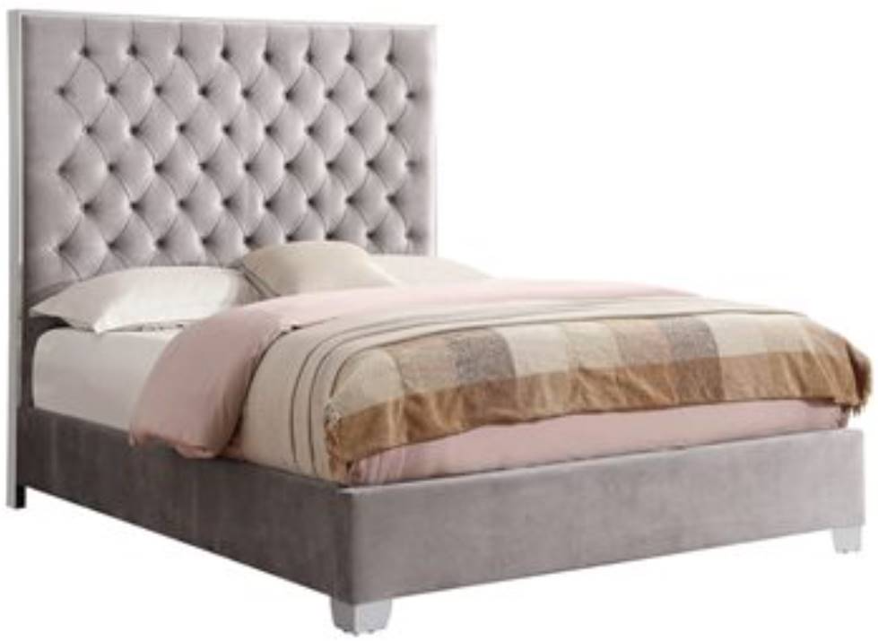 Create your sophisticated, luxurious master retreat with the Lacey bedroom collection. Luscious velvet-like fabric in silver gray is detailed with chrome trim and deep button tufts creating elegant softness. Transform your home with the stylish details and timeless beauty of Lacey!Read More