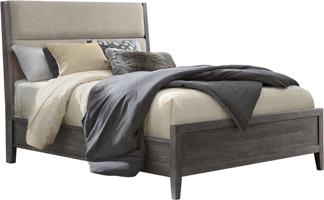 Spruce Veneer and hardwood solids. Contemporary style with heavily wire brushed dark spruce finish with silver undertones. The angular “ring pull” style hardware has an antique gold finish.Read More