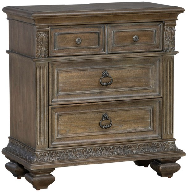The base features acanthus leaf carvings and square turned bun feet. There are three full extension drawers that are great for storage. The top drawer has a bluff-cut drawer front giving the illusion of multiple smaller drawers while still offering deep storage. The drawer fronts are wood framed and feature bead molding for added dimension and are accented with antique brass knob and drop ring hardware. The top drawer is felt lined, and the bottom drawer is lined with cedar. Utilize the convenience of the built-in charging station complete with two electrical outlets and two USB ports. Combine the grand feel of the past with today’s luxurious lifestyle with the Carlisle Court bedside chest with charging station.