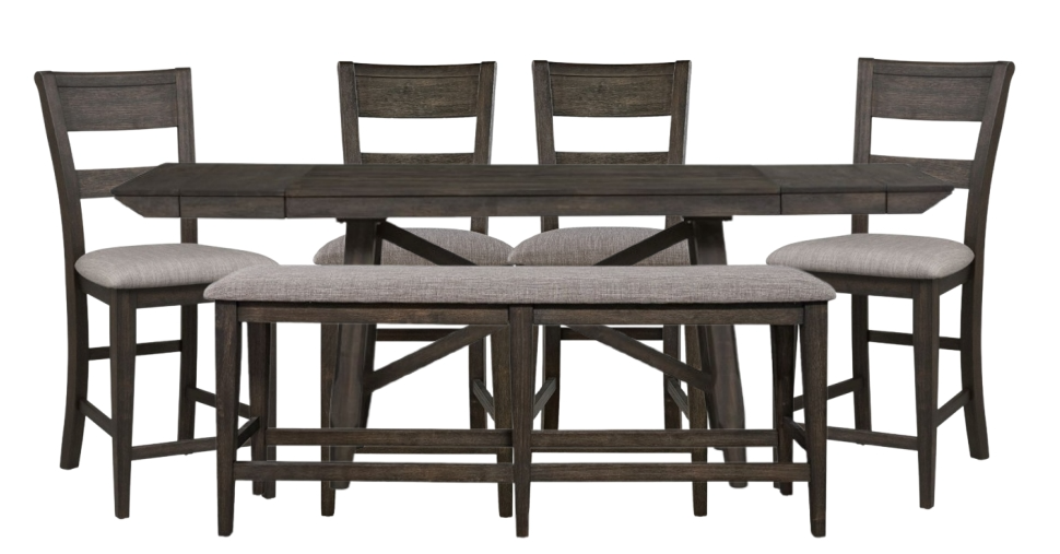Gather the family around the Double Bridge 6-piece gathering table set, consisting of a gathering table, four slat back counter chairs, and a counter bench. Crafted of rubberwood solids and acacia veneers, this kit features a dark chestnut finish with wire brushing.Read More