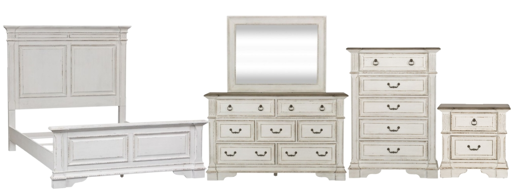 Design possibilities are endless with the Abbey Park queen panel bed, dresser, mirror, chest, and nightstand. Crafted of poplar solids and cathedral white oak veneers, this kit features an antique white finish with heavy chipping and weathered brown whitewash tops.Read More