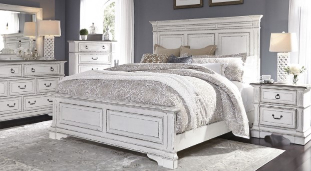 Design possibilities are endless with the Abbey Park king panel bed, dresser, mirror, chest, and nightstand. Crafted of poplar solids and cathedral white oak veneers, this kit features an antique white finish with heavy chipping and weathered brown whitewash tops, full extension drawers, premium felt-lined top drawers, and cedar-lined bottom drawers.Read More