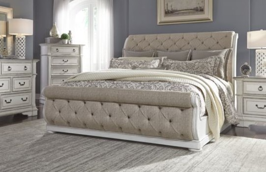 This sleigh bed features a rolled headboard and a bent rolled footboard, both upholstered in a beautiful, tufted chenille. The dresser has seven drawers and can equip the mirror that features a beveled edge with the included bolt-on supports. The chest offers an additional five drawers of storage. Place the two-drawer nightstand next to your bed, and enjoy the convenience of the built-in charging station, complete with two electrical outlets and two USB ports. The blending of European traditional design influences makes Abbey Park a truly unique style for any living space.