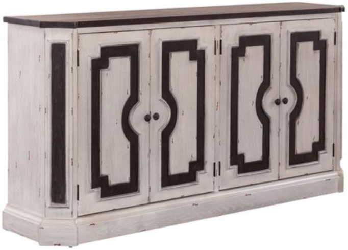 Features four doors with raised panels with accent bead molding, one fixed shelf behind each set of doors, canted corners, and wire management provisions to conceal wires. A great piece to use as a TV console.
