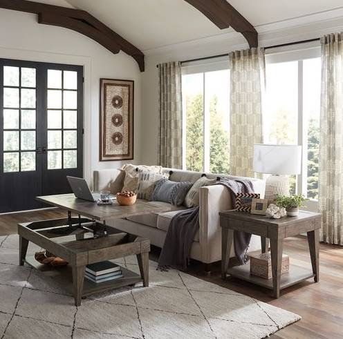 If you enjoy rustic, the Arrowcreek collection is for you. Crafted with solid reclaimed pine and pine veneers and finished in a weathered stone. Features slate tile inserts with a basket weave designed top, lift top cocktail table is great for working from home or dining in your living room and casters for easy movement.Read More