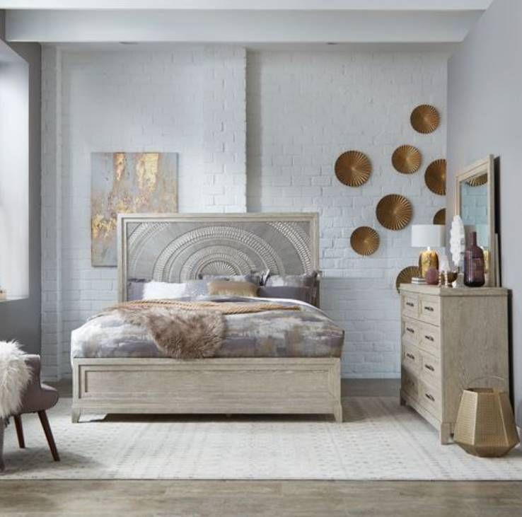 Elevate your luxurious home with the Belmar king panel bed, dresser, and mirror. Crafted of rubberwood solids and split heart oak veneers, this kit features a washed taupe and silver champagne finish, full extension drawers with premium felt lined top drawers and cedar lined bottom drawers.Read More