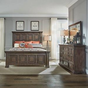 Live life beautifully with the Big Valley California king panel bed, dresser, and mirror. Crafted of rubberwood solids with birch veneers this kit features a brownstone finish with heavy distressing, wood framed doors and drawers.Read More