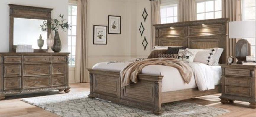 Set includes: Queen Panel Bed, Dresser & Mirror and Nightstand