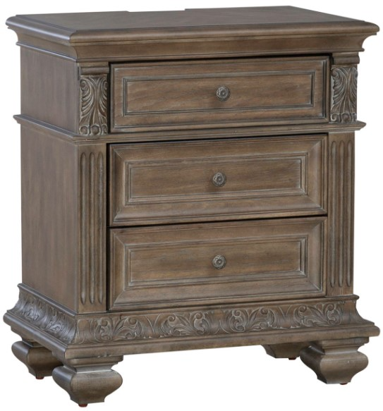 Indulge in luxury with the Carlisle Court three drawer nightstand with charging station. Crafted with excellence using rubberwood solids and rustic hickory veneers, this nightstand features a chestnut with gray dusty wax finish. The carved corbels accent fluted pilasters.Read More