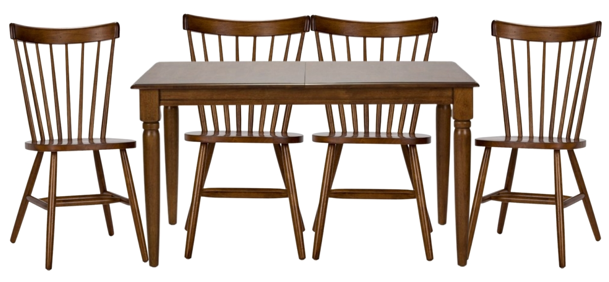 Be distinctively different with the Creations II five-piece butterfly leaf set. Crafted of rubberwood solids, this set features a tobacco finish and consists of the butterfly leaf leg table and four Copenhagen side chairs. The table features a 12” butterfly leaf that is anchored by turned legs.Read More