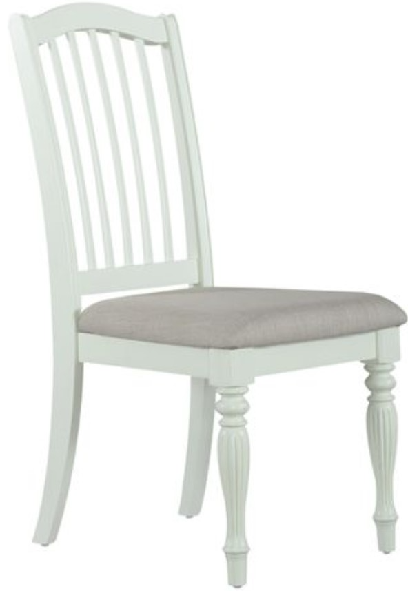 When details matter, choose the Cumberland Creek side chair. Crafted of rubberwood solids, this chair features a Buttermilk finish and a padded upholstered seat in Gray Linen upholstery. The slat back with an arched cap rail pairs nicely with the turned fluted front legs that feature nylon chair glides to protect your flooring.Read More