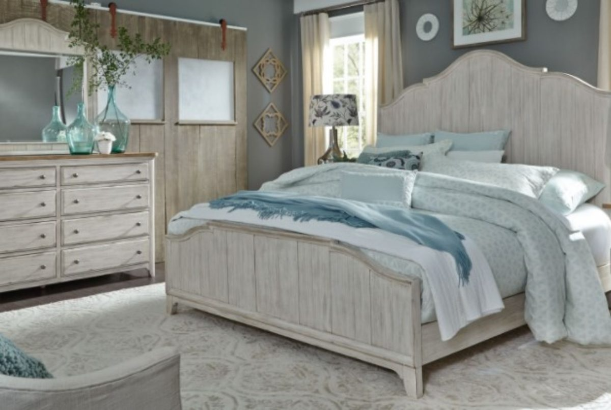 Warm and cozy. Bring beauty indoors with the Farmhouse Reimagined king panel bed, dresser, and mirror. Farmhouse Reimagined offers cottage styles that you love in a heavily distressed finish that will work from the beach to the mountains to an industrial loft.Read More