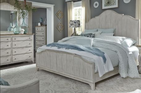Warm and cozy. Bring beauty indoors with the Farmhouse Reimagined California king panel bed, dresser, mirror, and chest. Farmhouse Reimagined offers cottage styles that you love in a heavily distressed finish that will work from the beach to the mountains to an industrial loft.Read More