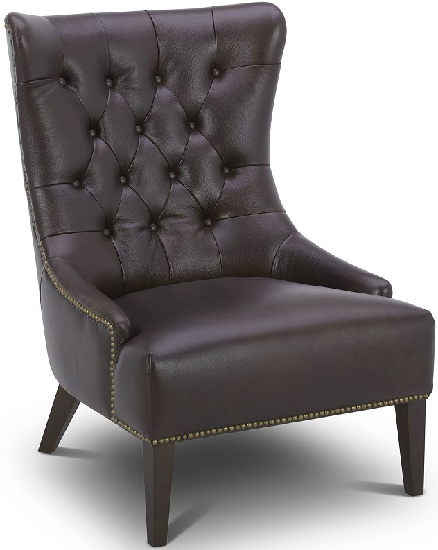 Create the Decor of your dreams with the Garrison leather accent chair. The Garrison features a high shaped back with sloped arms that cradles your body, accented with Antique Brass nail heads and button tufting.Read More