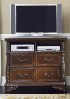 This Liberty Highland Court Media Chest has a beautiful traditional look and a gorgeous style. It's stunning design is beautifully finished by a rich cognac color and gold tipping accents. This Media Chest has four drawers with two shelves that you can store all your media products. It has elaborate detail carvings to give your bedroom an elegant style.