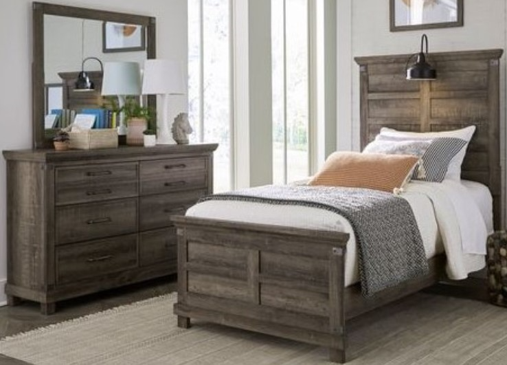 The beautiful sconce LED light at the center of the headboard can be used for task, ambient, or accent lighting. Use the youth panel bed rails featuring hook-on support to complete the bed. The dresser has hammered metal corner accent plates along with wood framed drawer fronts and Antique Pewter bar pull hardware for visual appeal. The top two drawers feature bluff-cut drawer fronts giving the illusion of multiple smaller drawers while still offering deep storage. Clean lines and block feet round out the rustic, cottage look. Attach the landscape mirror to the dresser with the included bolt-on supports. The mirror offers a unique point of view with hammered metal corner accent plates and a beveled edge for a sparkling visual appeal. The urban living design and the rustic charm or cottage appeal of the Lakeside Haven twin panel bed, dresser, and mirror offer style, substance, and handcrafted character.