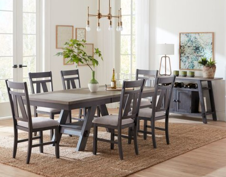 The table includes one 18-inch butterfly leaf to accommodate guests or a larger family, two-tone finish, and is anchored by a trestle base. The chairs showcase transitional styling and features a grey linen upholstery, nylon chair glides to protect your flooring, an inverted V-design splat back, tapered legs, and users can enjoy the convenience of the consumer-friendly assembly. The slate and weathered gray finish creates a look that is sure to pair beautifully with any décor in your home.