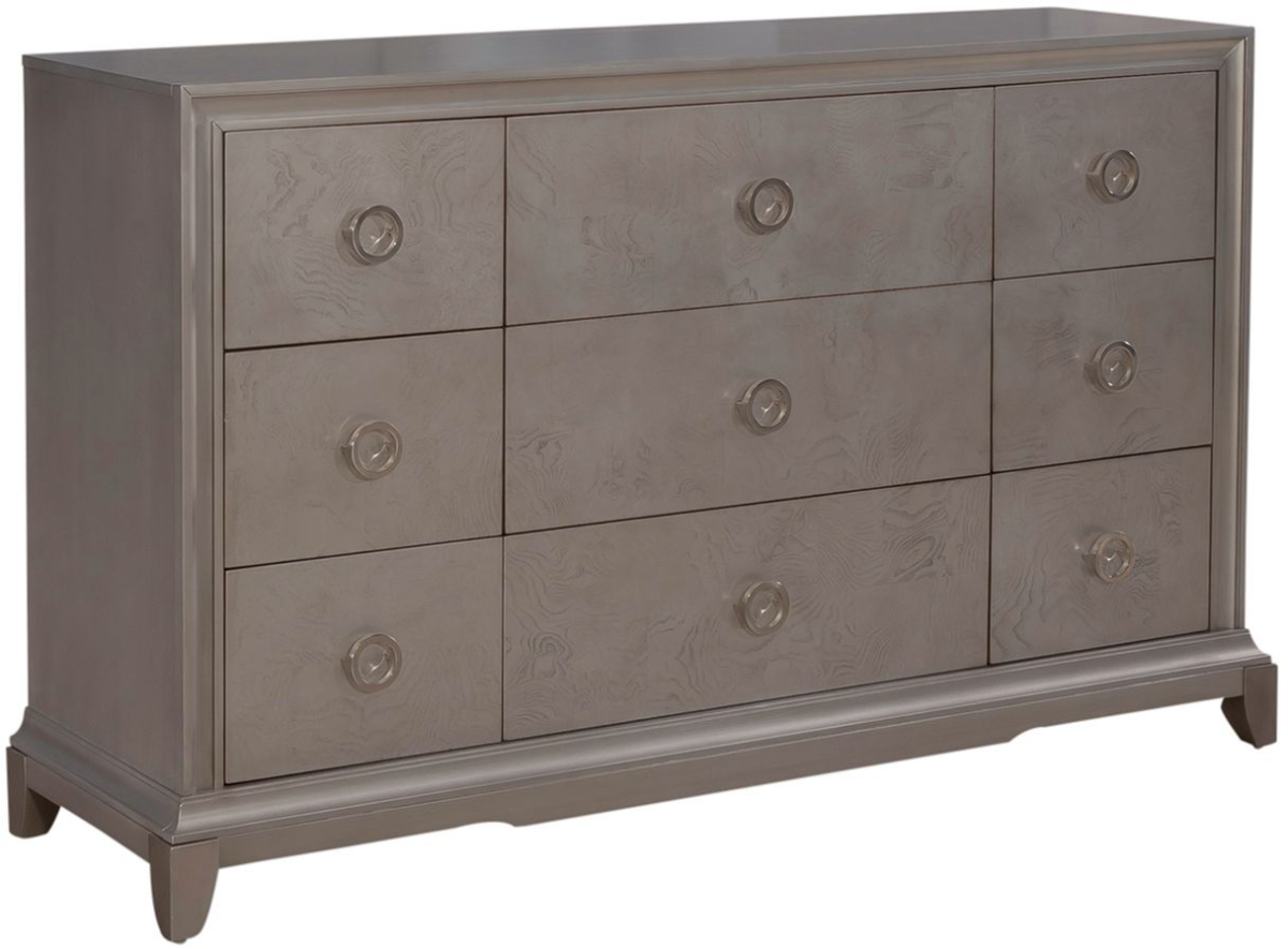 Luxe living is highlighted by a design that conveys luxury and sophistication. Choose the Montage dresser to achieve just that. Crafted of poplar solids with birch and ash burl veneers, this piece features a platinum finish with brushed satin nickel ring hardware.Read More