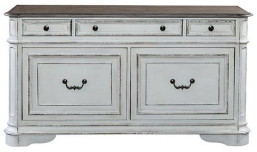 Blend European influences to create the Magnolia Manor credenza. Crafted with poplar and rubberwood solids with white oak and birch veneers, this piece features two large file drawers and three fully stained full extension drawers accented by antique pewter bail pull and knob hardware.Read More