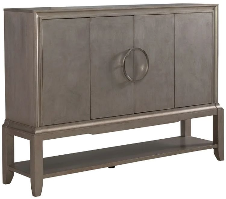 Reinvent your style with the Montage server. Crafted of poplar solids with ash burl veneers, this piece features a platinum finish with oversized brushed nickel center circular hardware with touch latch doors. Storage abounds with one adjustable shelf behind the center two doors, and two adjustable shelves behind each side door. There is an open bottom shelf for additional storage or display items. The tapered legs and offset apron continue to add character to this piece.Read More