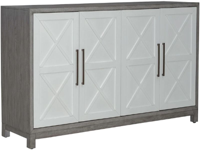 Whether you want to escape to the good life where every day is a vacation, or you want to bring a new level of casual sophistication to your home, Palmetto Heights offers a way to express your personality without sacrificing style. This accent buffet features picture frame molding with four wood framed doors with double X-style overlays. The doors are supported by European soft close hinges and are accented with Pewter Wash bar pull hardware. There is one adjustable shelf behind each set of doors. The block foot base adds a contemporary element to the clean lines of the buffet. The Palmetto Heights accent buffet offers a unique point of view that is sure to inspire.
