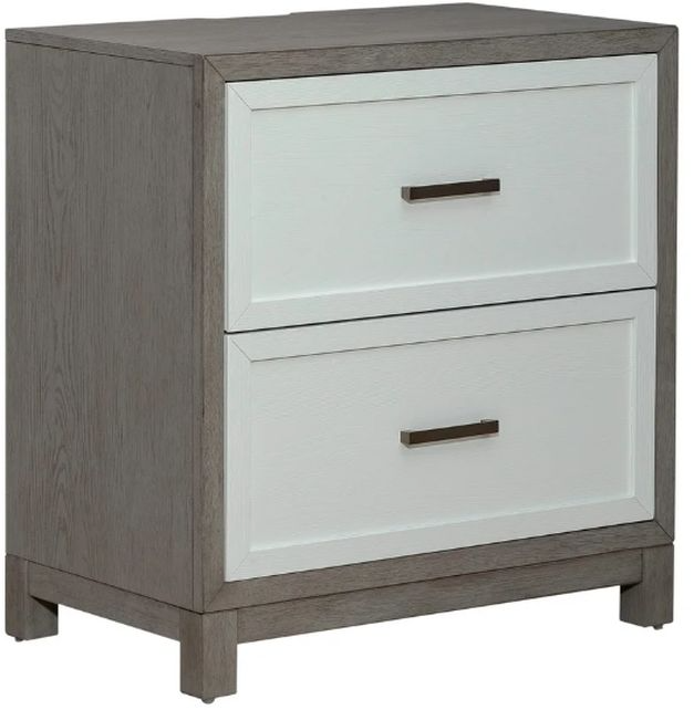 The two-tone finish blends the best of casual contemporary and costal living where picture frame molding outlines wood framed drawer fronts. There are two full extension drawers offering plenty of storage that features a premium felt lined top drawer and cedar lined bottom drawer, all accented with Pewter Wash bar pull hardware. The block foot base adds a contemporary element to the clean lines of the nightstand. Place the nightstand next to your bed and utilize the convenience of the built-in charging station complete with two electrical outlets and two USB ports. The Palmetto Heights two drawer nightstand offers a unique point of view that is sure to inspire.