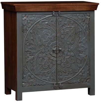 Accent your space with the Sahana two door accent cabinet. Crafted of mango solids, this piece features a warm nutmeg with teal finish, appealing carved floral and leaf pattern door overlay, two interior shelves for additional storage, and wooden knob hardware. This eclectic cabinet would make a wonderful addition to any home.Read More