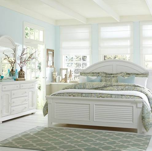 The panel bed features louvered panels and arched crown molding. The dresser has two louvered panel doors and five drawers including two smaller flip down top drawers. Attach the arched louvered panel mirror with a beveled edge with the included bolt-on supports. With cottage design always in fashion, make the Summer House I a staple in your home.