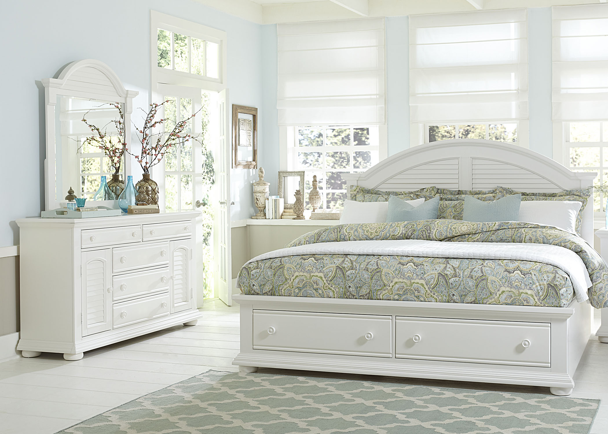 Liberty Summer House l Bedroom King Storage Bed, Dresser and Mirror Collection with full extension metal side drawer glides and bottom case dust proofingRead More