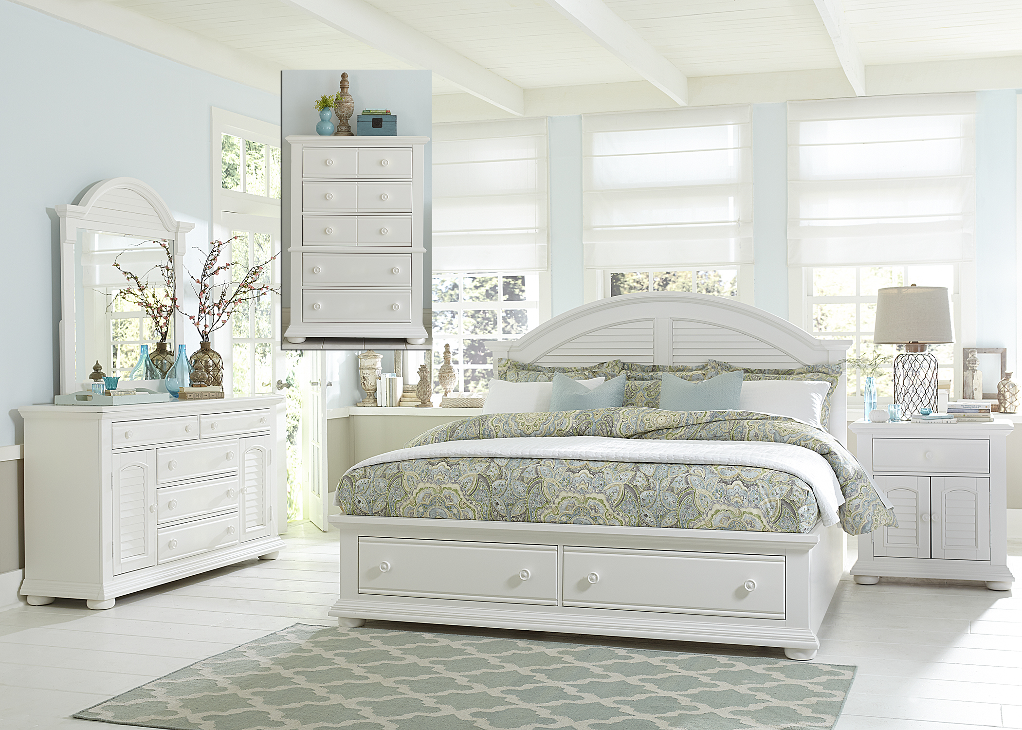 Liberty Summer House l Bedroom King Storage Bed, Dresser, Mirror, Chest and Night Stand Collection with full extension metal side drawer glides and bottom case dust proofingRead More