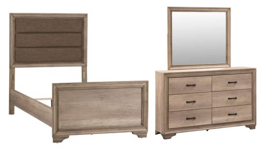*3-piece bedroom set includes upholstered panel bed, 6-drawer dresser, and mirror only. Other piece sold separately