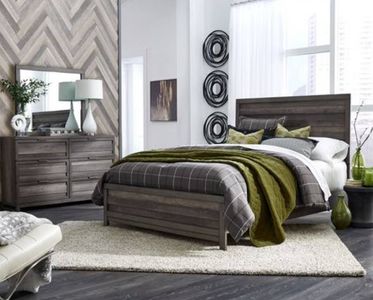 Move away from the traditional and bring in a clean and simple look with the Tanners Creek king panel bed, dresser, and mirror. Crafted of melamine and rubberwood solids, this kit features a Greystone finish, laminate drawer interiors, solid wood picture frame fronts, a high-low effect created by solid wood strip onlays.Read More