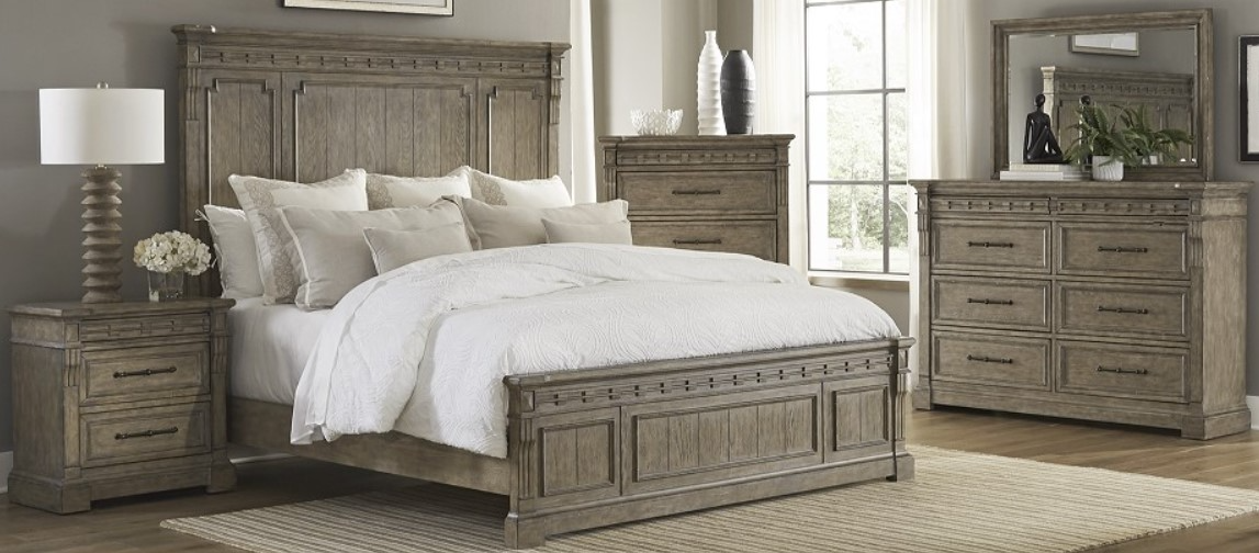 Set includes: Queen Bed, Dresser & Mirror, Chest and Nightstand