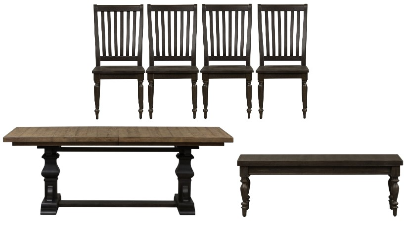 The trestle table features a thick butcher block planked top with a solid wood edge, a 20” self-storing leaf, and a two-tone finish. The slat back side chairs have a saddle shaped seat for added comfort, and nylon chair glides to protect your flooring. The bench has a planked seat, turned legs, and nylon chair glides.