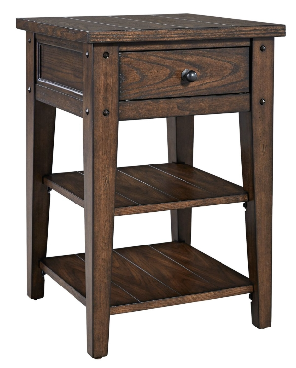 Accent your space with the casual country style Lake House chair side table. Crafted of poplar solids and oak veneers, this piece features a simplistic wood and peg accents, one drawer accented by antiqued brass knob hardware, anchored by a tapered leg design.Read More