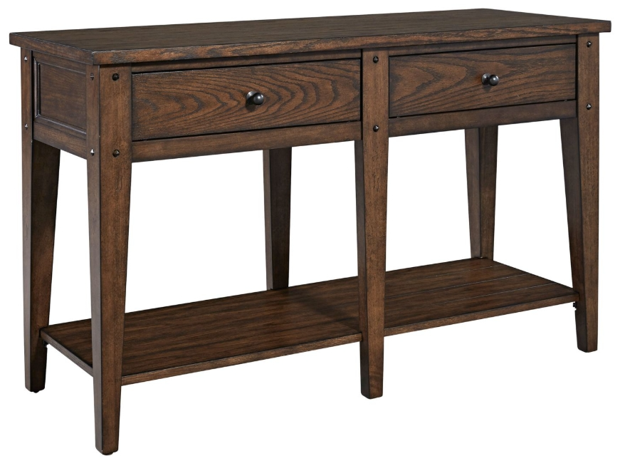 Accent your space with the casual country style Lake House sofa table. Crafted of poplar solids and oak veneers, this piece features a rustic brown oak finish, appealing planked top, bottom planked shelf and two drawers for additional storage, simplistic wood and peg accents, antiqued brass knob hardware, anchored by a tapered leg design.Read More