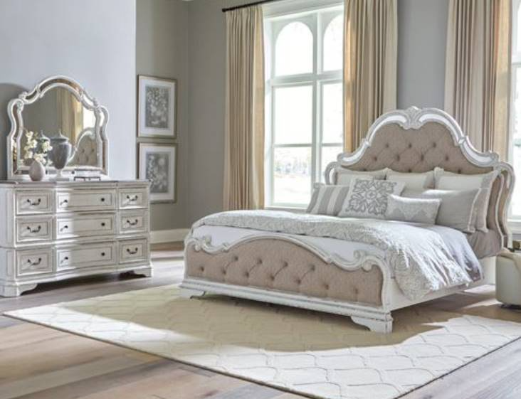 The bed is upholstered in tufted chenille, laced with tone’s of white, tan and brown threading. The scalloped headboard is framed with antique mirrors and features the unique dog bone accents that our Magnolia Manor is famous for. The dresser and mirror duo are the perfect way to accent your room. Weathered brown whitewash tops paired with the antique white finish creates a truly unique look. Softness is added to the design with canted corners and rounded pilasters, accompanied by bead molding on each drawer front. The dresser features fully stained interior drawers, felt lined top drawers, and dust proofed bottom drawers that are accented by antique pewter bail and knob hardware. Warm antique finishes and artistic distressing along with grand scale creates a group to be passed to generations.