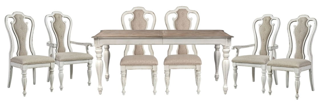 Create a grand gathering with the Magnolia Manor seven-piece leg table set, consisting of four splat back upholstered side chairs, two splat back upholstered arm chairs, and a rectangular leg table.Read More