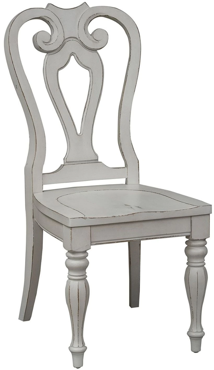 Sit in comfort with the Magnolia Manor splat back side chair. Crafted of rubberwood solids,, this piece features the perfect blend of European design, saddle shaped seat, dog bone accents on the splat back, nylon chair glides, and beautifully turned legs.Read More