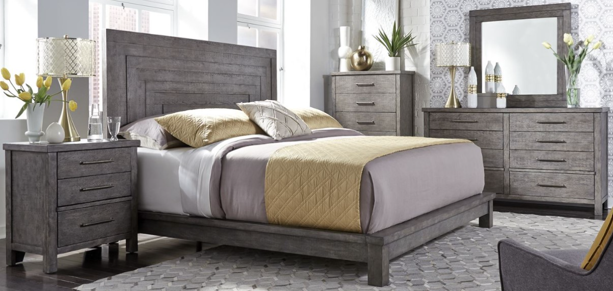 Inviting and inspirational describes the Modern Farmhouse queen platform bed, dresser, mirror, and nightstand. Crafted of poplar solids with knotty white oak veneers this kit features a dusty charcoal finish with heavy distressing.Read More