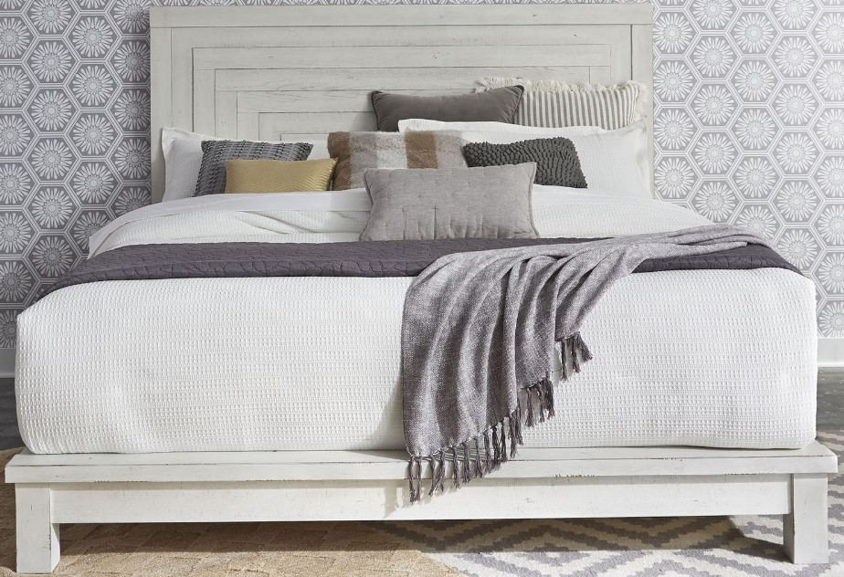 Accent your bedroom with the perfect farmhouse design, using this unique and stylish platform bed. Crafted with rubberwood solids and knotty white oak veneers, this piece features bolt on rails, a platform footboard, and a geometric pattern. This bed does not require a box spring, allowing for a true platform feel.Read More