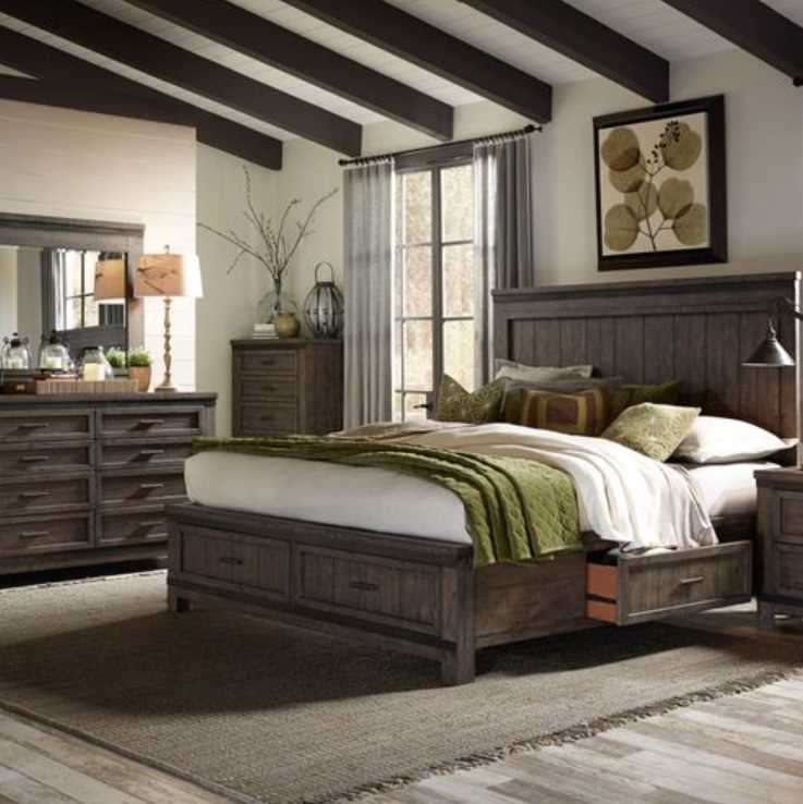 Enhance your home with the Thornwood Hills king two-sided storage bed, dresser, and mirror. Crafted of rubberwood solids with mango veneers, this kit features a rock-beaten grey finish with saw cuts. Add this unique bedroom set to your traditional style home.Read More