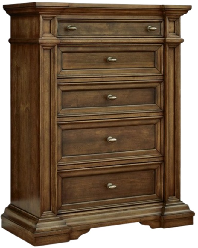 Time-honored style, made for today's home. This chest of drawers pays homage to traditional aesthetics, with a richly detailed finish incorporating a sense of stately elegance. Substantially-scaled moulding details and antiqued brass-tone knobs round out the piece in graceful fashion.Read More