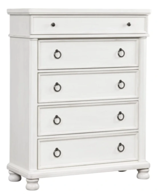 The Signature Design by Ashley® Rowlenstown Antique White 5-Drawer Chest is a charming and functional piece that brings a touch of rustic character to any bedroom. Finished in a warm antique white, it features five spacious drawers with metal knobs and pulls in a dark, contrasting tone.Read More