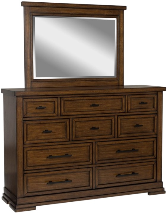 The Taffenbrook Medium Brown Dresser and Mirror set features a timeless design with a rich medium brown finish. Crafted for durability, it offers ample storage space with spacious drawers, making it a practical and stylish addition to any bedroom. The matching mirror enhances its elegant look.Read More