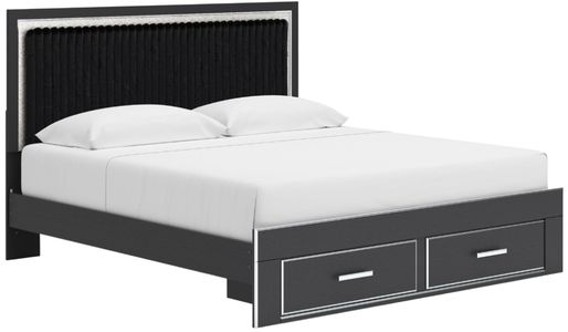 Includes upholstered panel headboard, storage footboard, platform rails and roll slats