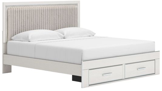Includes upholstered panel headboard, storage footboard, platform rails and roll slats